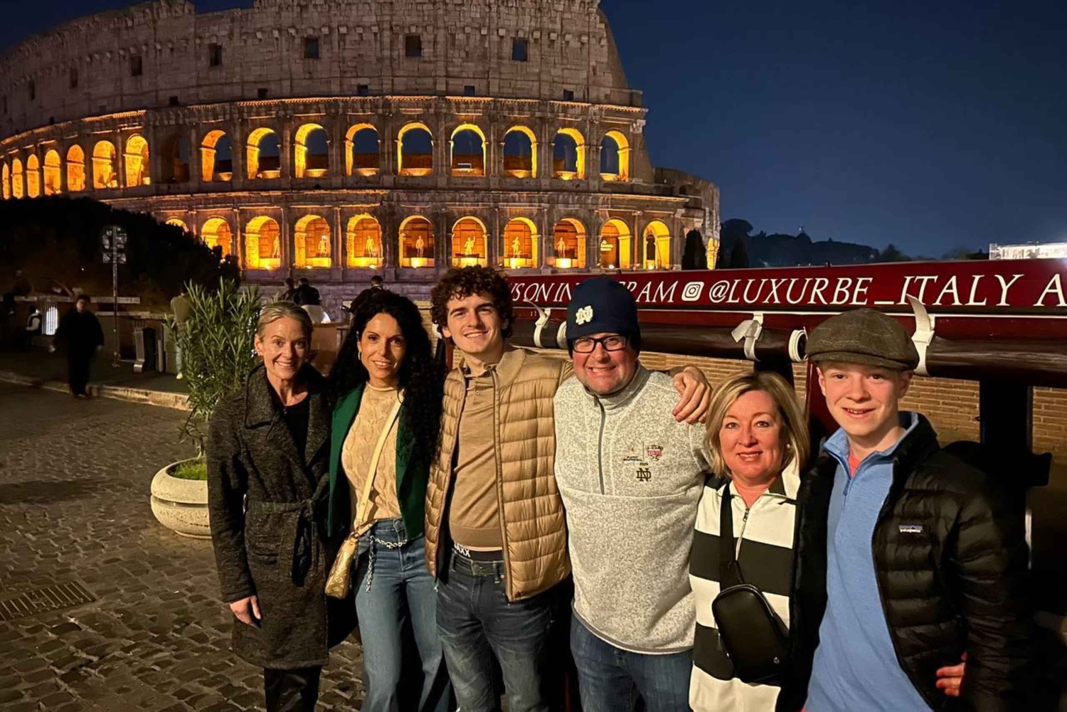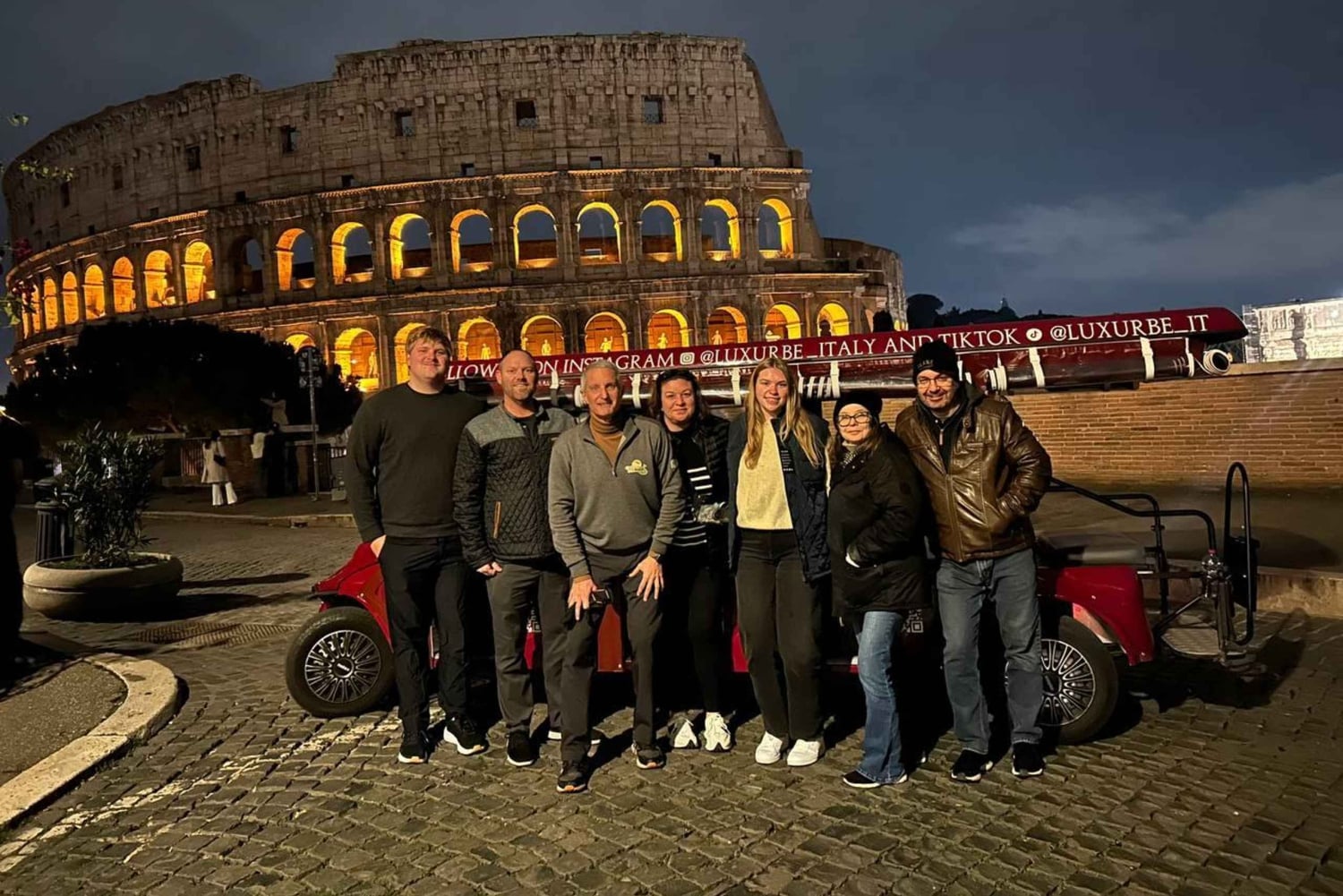 Oplev Roms magi under stjernerne med vores aftenrundtur i golfvogn! Tag med på en 90 minutters ekspresrundtur gennem hjertet af den evige stad, når bløde lys og stille gader forvandler Rom til et betagende friluftsmuseum. Med udgangspunkt i Via dei Condotti 61 kører vi gennem den oplyste by for at beundre dens mest ikoniske vartegn i en unik og fortryllende natlig atmosfære. Kast en mønt i den glitrende Trevifontæne, bestig de romantiske Spanske Trapper, beundr Pantheons arkitektoniske vidunder og nyd den livlige aftenstemning på Piazza Navona. Turen inkluderer også det majestætiske Colosseum, det mystiske Forum Romanum, det legendariske Circus Maximus og det gamle Marcellusteater – alt sammen smukt oplyst efter solnedgang. Nyd komfortable sæder, en ekspertguide og en rute, der er designet til at vise Roms skønhed om natten. Som prikken over i'et vender du tilbage med en panoramaudsigt fra Trinità dei Monti, den perfekte afslutning på dit romerske eventyr. ✨ Rom om natten er en helt anden by – kom med os, tag fantastiske fotos og skab minder, der vil vare hele livet.Includes