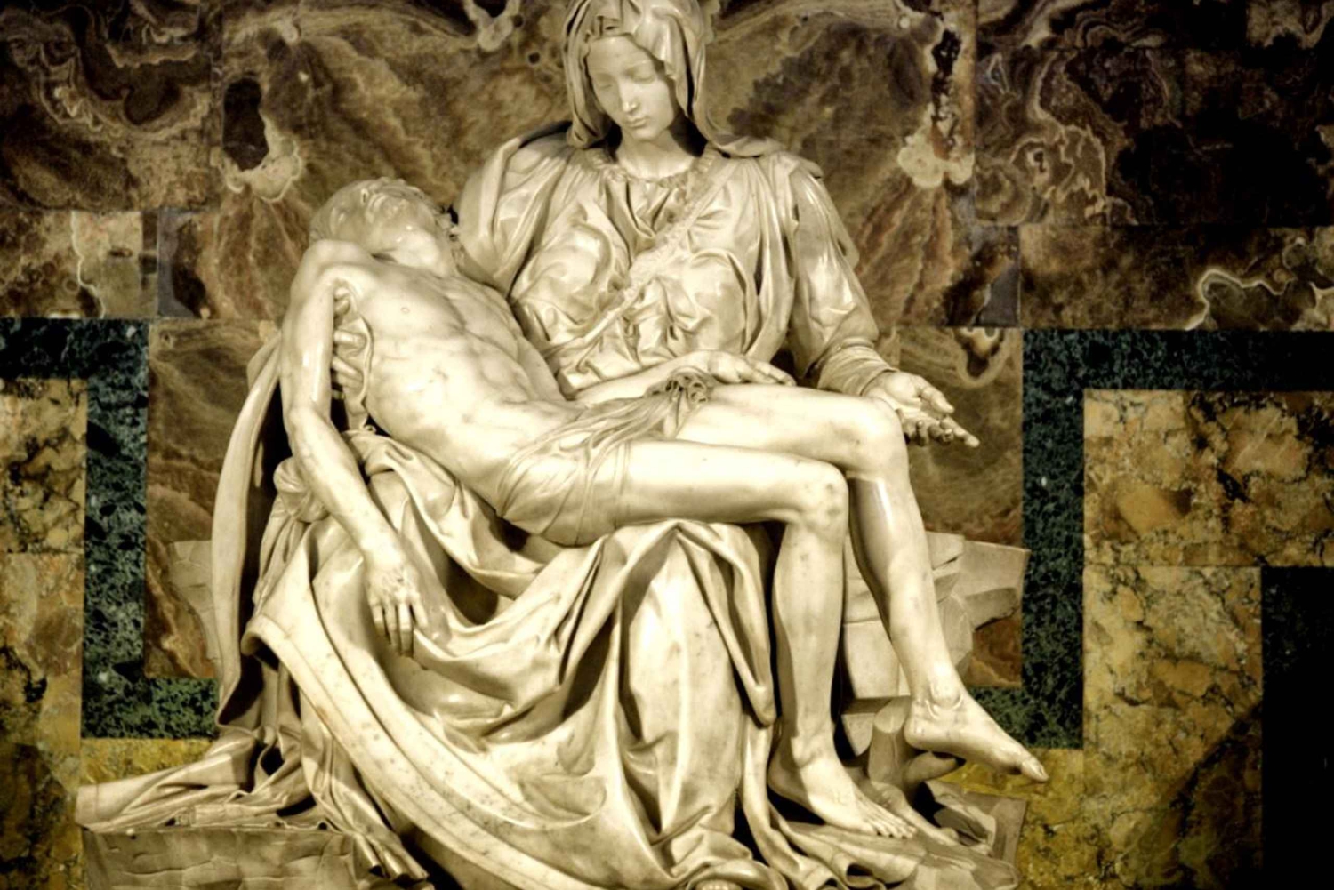 Oplev Peterskirkens vidundere på en komplet guidet tur, der er designet til at afsløre historien, kunsten og de skjulte detaljer i verdens største kirke. Mød din ekspertguide i nærheden af Vatikanet og begynd dit besøg med en oversigt over Peterspladsen og dens arkitektoniske design af Bernini. Gå ind i basilikaen og beundre det betagende interiør, hvor mesterværker som Michelangelos Pietà og Berninis Baldachin fanger essensen af renæssance- og barokkunsten. Mens din guide fører dig gennem det store skib og sidekapellerne, lærer du om de historier, symboler og traditioner, der har formet Vatikanets historie. Din tur inkluderer også et besøg i pavens grave, der ligger under basilikaen. Her kan du udforske pavernes højtidelige hvilested og opdage den åndelige betydning af dette hellige sted. Under hele turen vil din guide dele sin ekspertviden om de religiøse og kunstneriske skatte, der gør Peterskirken til et af verdens vigtigste pilgrimsrejsemål. Uanset om du besøger kirken for kunstens, historiens eller troens skyld, giver denne guidede tur en komplet og berigende oplevelse af Peterskirken.Includes