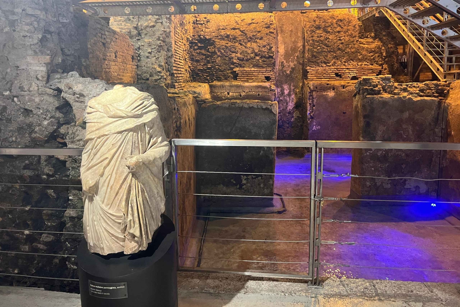 El punto destacado del tour es un descenso al recientemente descubierto Vicus Caprarius, la «ciudad del agua». Situado a 9 metros bajo tierra, este extraordinario yacimiento arqueológico revela un acueducto de 2000 años de antigüedad que sigue suministrando agua a la Fontana de Trevi en la actualidad. Pasea por los restos de un domus imperial y maravíllate con las antiguas estructuras que se remontan al Imperio romano. Toca la estratificación milenaria bajo las calles de Roma y experimenta de primera mano la profundidad de la larga historia de la ciudad.