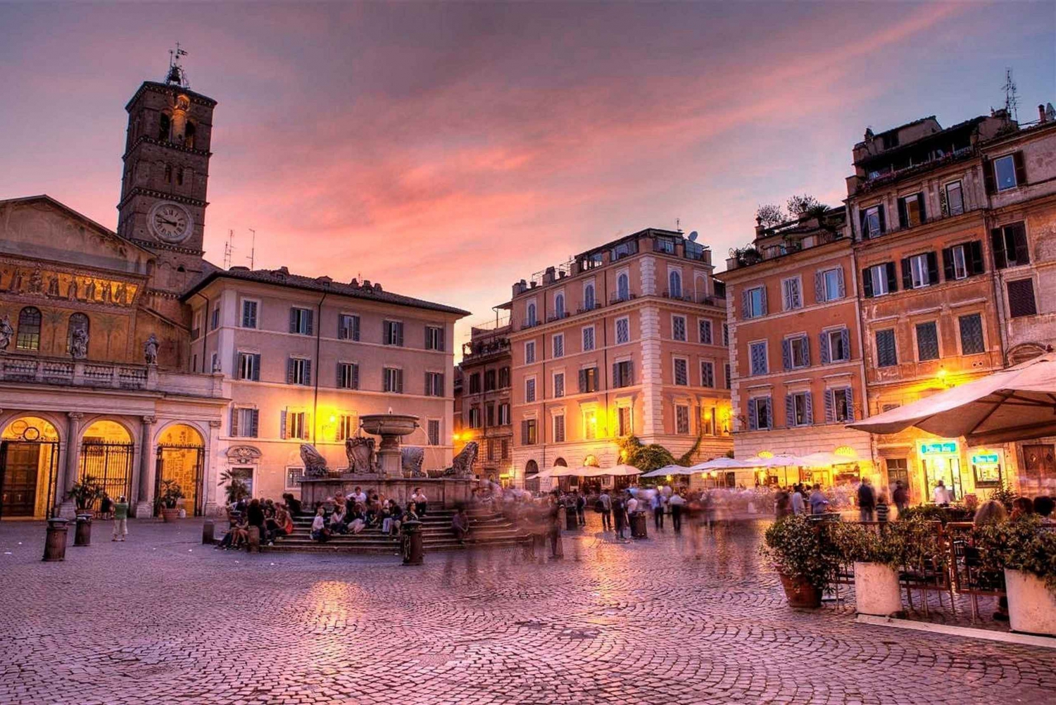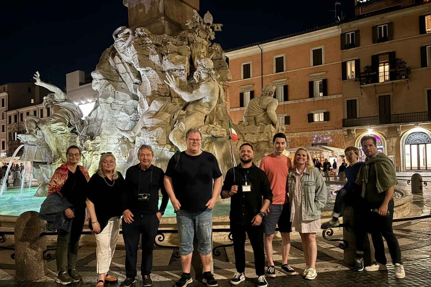 Tällä kierroksella tutustut ikuisen kaupungin viehätykseen, kun kävelet historiallisessa keskustassa ja ihailet sen kuuluisia aukioita, suihkulähteitä ja monumentteja. Piazza Navona, roomalaisista aukioista tyylikkäin, on kosmopoliittinen kohtauspaikka, jossa on monia ulkoilmakahviloita ja jossa sijaitsevat Berninin kuuluisa Neljän joen suihkulähde ja Sant'Agnese in Agone -kirkko.Campo de Fiori on roomalaisten aukio, jossa perinteet ja suosio ovat yhä elossa. Pantheon, jossa on suurin koskaan raudoittamattomasta betonista rakennettu puolipallonmuotoinen kupoli ja joka on yksi parhaiten säilyneistä antiikin Rooman rakennuksista. Trevin suihkulähde, kaupungin suurin barokkilähde ja yksi maailman kuuluisimmista suihkulähteistä, Rooman ikoni. Piazza di Spagna, jonka okraväristen rakennusten luoma 1700-luvun tunnelma, Berninin suihkulähde La Barcaccia ja upeat ja kuuluisat Espanjalaiset portaat, jotka johtavat Trinità dei Montin kirkkoon. Piazza del Popolo ja sen upeat panoraamanäkymät Pinciolta. Opas kertoo myös anekdootteja ja tarinoita taiteilijoista ja maineikkaista henkilöistä, jotka ovat jättäneet nämä upeat taideteokset kaupunkiin.Includes