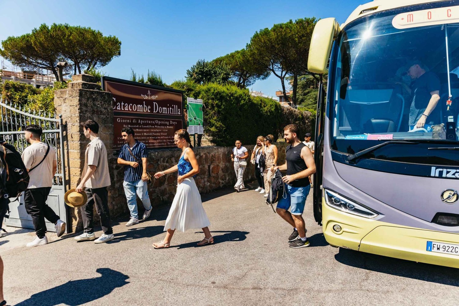 Löydä Rooman kaduilla piilevät historian kerrokset. Matkusta ilmastoidulla bussilla ja pääse suoraan kolmeen kiehtovaan arkeologiseen löytökohteeseen ilman jonotusta. Vieraile kapusiinikryptassa ääniohjattavalla kierroksella. Kapusiinimunkit käyttivät lähes 4 000 veljensä luita koristamaan lattiasta kattoon ulottuvia kuvioita, mikä antoi kryptalle sen karmean lempinimen 'luukappeli'. Täältä sinut kuljetetaan mukavalla bussilla pyhiin katakombeihin, joissa varhaiset kristityt harjoittivat kiellettyä uskoaan vainojiensa jalkojen alla. Lähes 2 000 vuotta sitten tämä salainen tunneliverkosto toimi sekä palvontapaikkana että hautausmaana. Tutkiessasi kiinteästä kivestä tehtyjä hautoja paikallinen asiantuntijaopas kertoo tämän pyhän paikan kiehtovasta historiasta. Seuraavaksi matkustat San Martino ai Montin basilika, joka on yksi Rooman parhaiten varjelluista salaisuuksista. Tämä historiallinen kirkko on peräisin 4. vuosisadalta ja rakennettu antiikin Rooman perustusten päälle. Se paljastaa kaupungin monikerroksisen uskonnollisen menneisyyden. Sisällä on upeita barokkityylisiä freskoja, antiikin mosaiikkeja ja jäänteitä titulus-nimisestä varhaiskristillisestä palvontapaikasta. Älä missaa tilaisuutta tutustua maanalaisiin kammioihin, joissa vuosisatojen usko ja historia heräävät eloon. Voit myös valita eksklusiivisen 'After Hours' -kierroksen kapusiinikryptissa ja Rooman katakombeissa ainutlaatuisen maanalaisen seikkailun. Tutustu muinaisiin hautapaikkoihin, piilotettuihin tunneleihin ja kammottaviin pyhäinjäännöksiin selkäpiitä karmivalla matkalla kaupungin alla. Avaa silmäsi kaupungin salaiselle puolelle – et enää koskaan näe Roomaa samalla tavalla. Tämä palvelu päättyy Piazza Barberinilla tai San Nicola in Carceren uloskäynnillä.Includes
