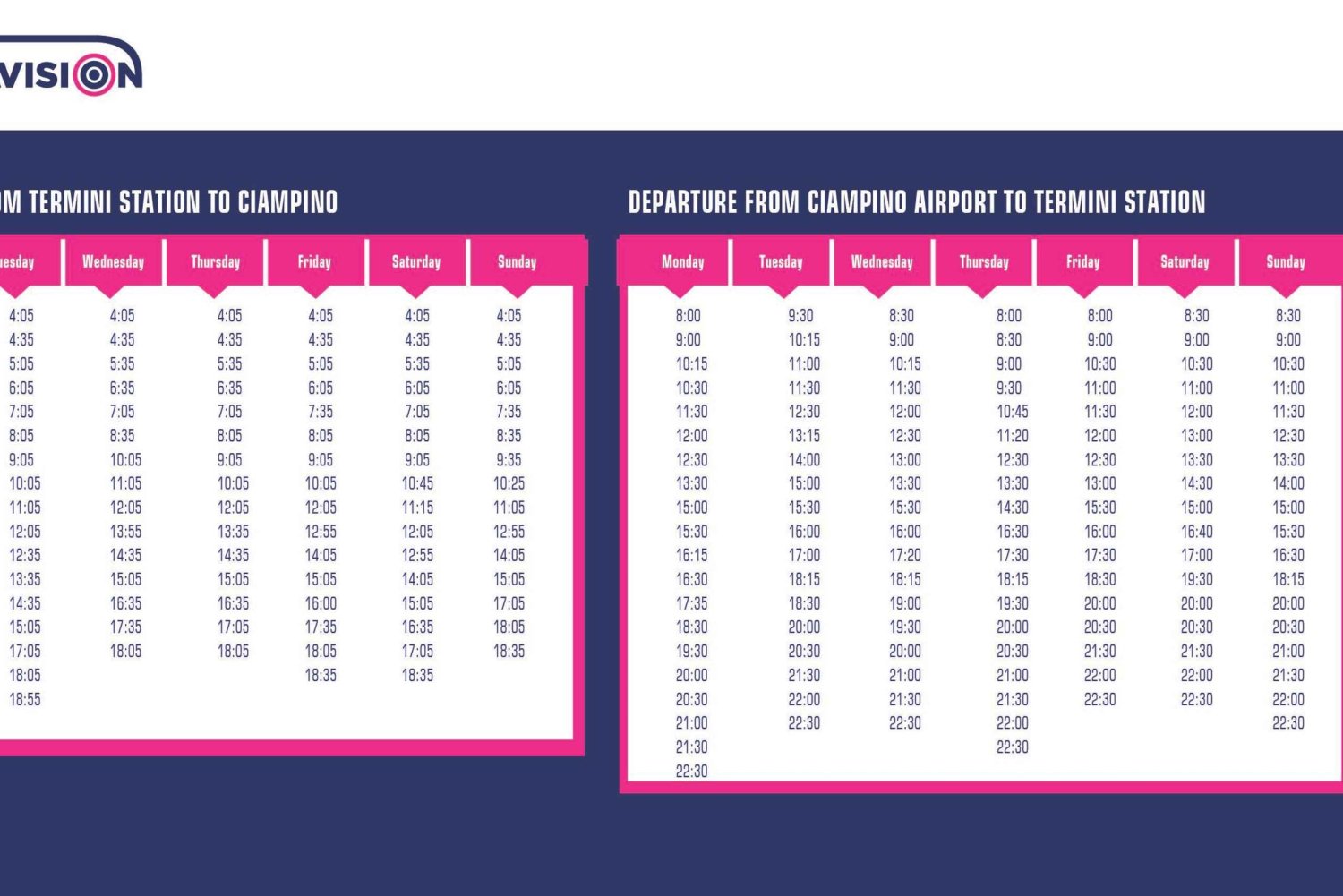 4495 ReviewsVaraa kuljetus Ciampinon lentokentältä ja Rooman keskustasta (Termini-asemalta) etukäteen ja säästä. Nauti suorista, ilmastoiduista bussimatkoista, joissa matkatavarat kuljetetaan ilmaiseksi.