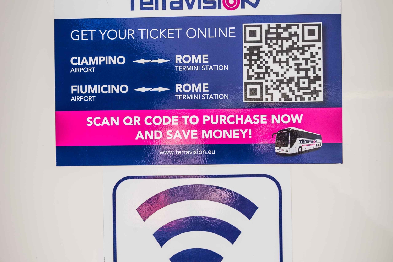 • Le premier bus quitte l'aéroport à 8h30 et le dernier à 22h00 Le premier bus part de Termini à 4 h 05 et le dernier à 18 h 55 Il n'est pas nécessaire d'imprimer votre billet ; il suffit de présenter votre billet électronique (avec le code QR) à notre personnel à l'arrêt. Il est recommandé de choisir un bus qui arrivera à l'aéroport au moins deux heures avant l'heure de départ prévue de votre vol afin de vous laisser le temps de vous enregistrer.
