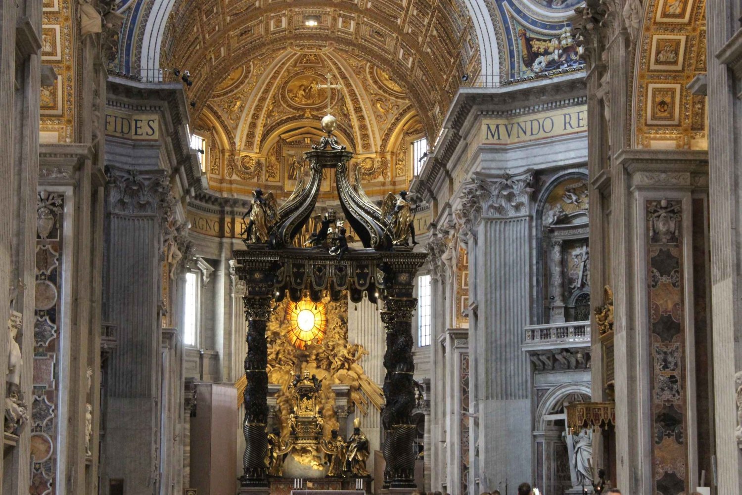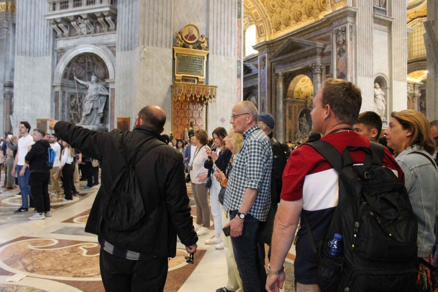Partecipa a un esclusivo tour guidato di 2 ore della Basilica di San Pietro: un viaggio attraverso secoli di arte, fede e storia. Inizia dall'impressionante Piazza San Pietro, dove il magistrale progetto del Bernini, con i suoi colonnati avvolgenti e l'obelisco centrale, fa da sfondo a un'esperienza coinvolgente. Con l'ingresso riservato, passa senza problemi dal vivace spazio pubblico all'interno sacro, mentre la tua guida autorizzata ti svela la storia stratificata della basilica, dalla rinascita rinascimentale agli abbellimenti barocchi. Ammira il Baldacchino del Bernini, un monumentale baldacchino in bronzo che corona l'altare maggiore con colonne tortuose e rilievi intricati, simbolo dell'aspirazione divina e dell'autorità papale. Poi, scopri la bellezza struggente della Pietà di Michelangelo, una magistrale scultura in marmo che cattura la profonda compassione della Vergine Maria e la serena accettazione della perdita con una finezza tecnica senza pari. Il tour si conclude con un'esplorazione riflessiva delle tombe papali, dove storia e memoria sacra si intrecciano per onorare l'eredità duratura dei leader della Chiesa.Includes