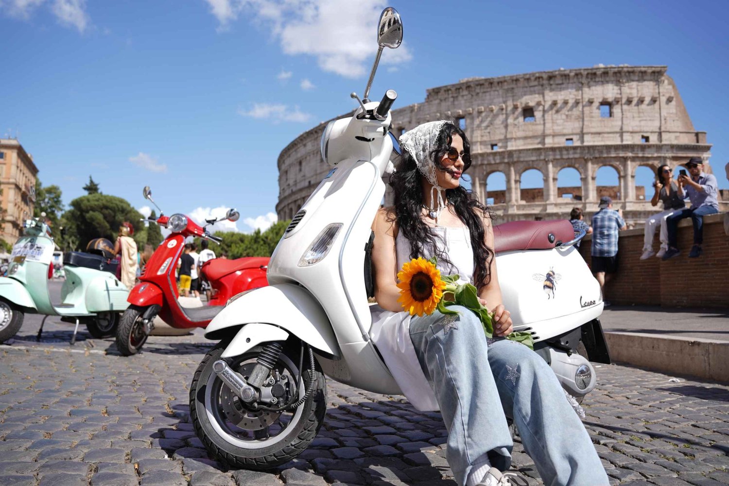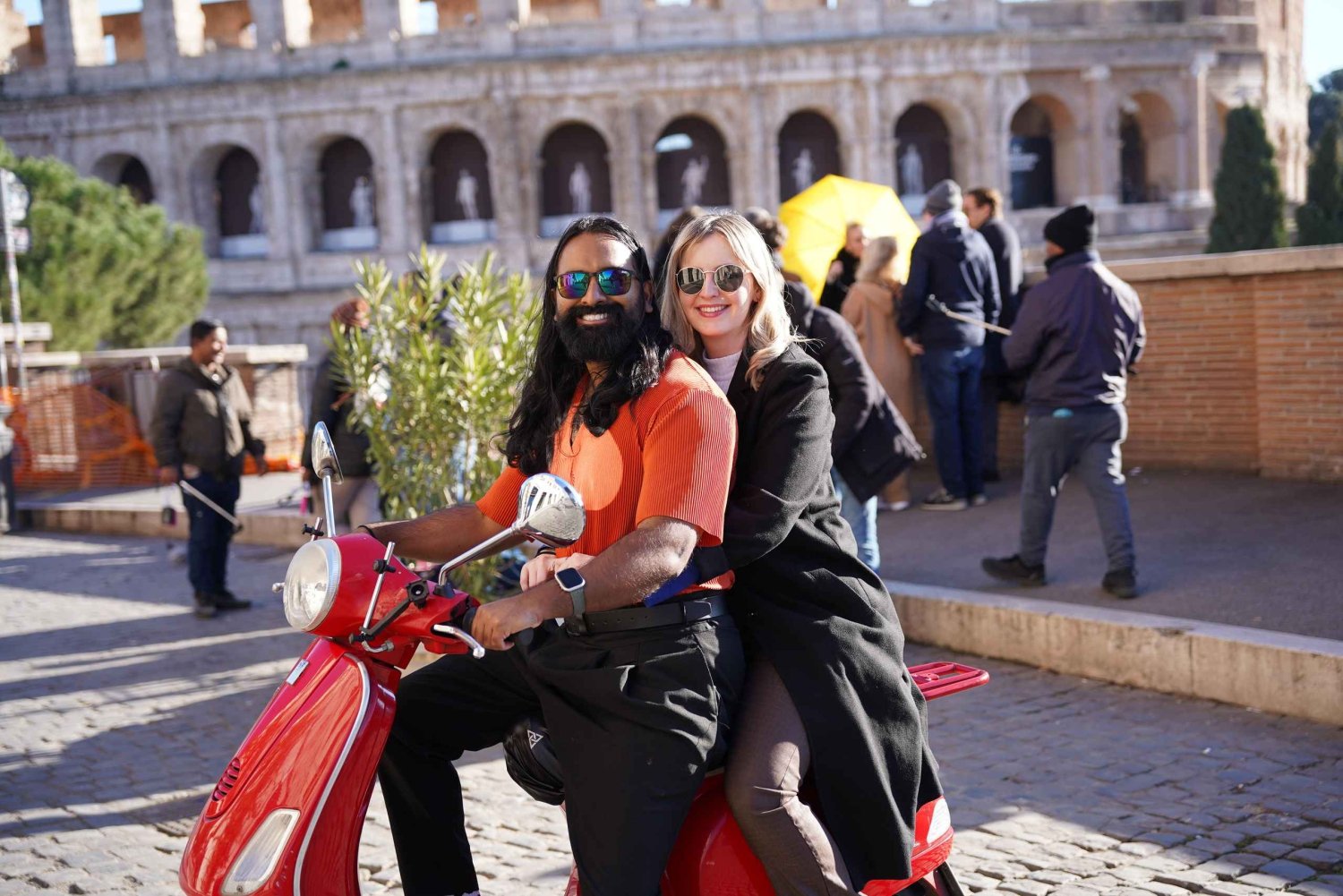Unisciti a noi per un emozionante tour in Vespa a Roma, un viaggio pieno di luoghi storici e esperienze deliziose! ***** ESPERIENZA SOLO PER PASSEGGERI In questo tour, ti divertirai a fare il passeggero mentre i nostri esperti autisti ti portano in giro per le affascinanti strade di Roma. Incontra la tua guida nel cuore della città, mettiti il casco e parti in sella a una vespa. Ascolta le storie e i fatti affascinanti su Roma e il suo patrimonio culinario. Rilassati senza preoccuparti del traffico e della navigazione mentre la tua guida ti porta in giro per le incantevoli strade di Roma. Termina il tour vicino alla stazione della metropolitana del Colosseo. Il pacchetto del tour include un servizio fotografico professionale. Riceverai le foto entro 3 giorni. Tieni presente che il tempo massimo di attesa è di 10 minuti. Per motivi di sicurezza e comfort, gli ospiti che pesano più di 95 kg non possono partecipareIncludes