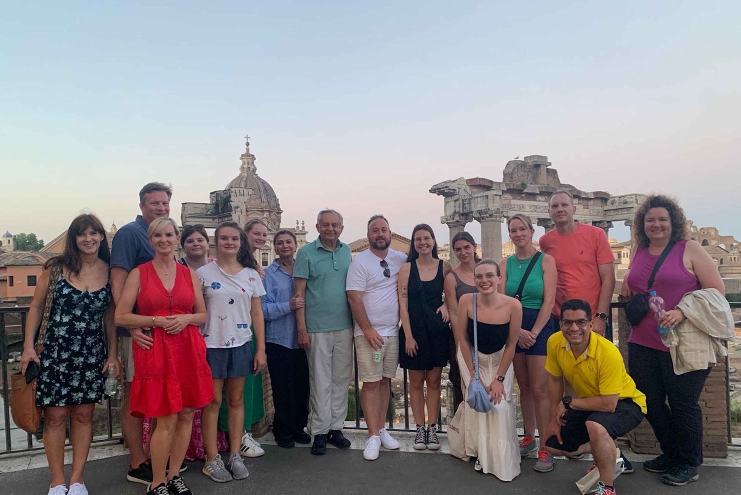 Scopri il cuore dell'antica Roma, splendidamente illuminato, con un piccolo gruppo e una guida esperta. Il tuo tour inizia ai piedi del Vittoriano, che domina Piazza Venezia. Segui la tua guida fino alla cima del Campidoglio per ammirare l'indimenticabile vista del Foro Romano. Passeggia lungo il viale dei Fori Imperiali e scopri la potenza dell'antico impero. Esci dai sentieri battuti e passeggia per l'antico rione Monti, luogo di nascita di Giulio Cesare. Passeggia in un palazzo appartenuto a Papa Borgia. Infine, ammira con stupore l'imponente facciata del Colosseo al termine del tuo tour.Includes