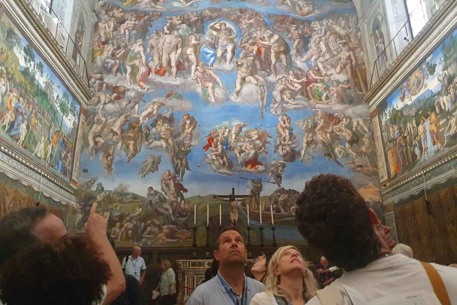 バチカン美術館に向かう前に、集合場所で入場券を受け取ってください。長い列を通り抜けて、事前に予約した時間枠で入場すれば、時間を節約できます。そして、中に入ったら、ゆっくりとこの美術史の宝庫を探索してください。 バチカン美術館の広大なホールを巡る旅に出発しましょう。印象的なバチカンの中庭、ピオ・クレメンティーノ美術館、カンデラブラのギャラリーなどの名所を見学してください。 ラファエロの間を訪れてルネッサンス時代を追体験し、見事なボルジアのアパートを散策し、タペストリーの間の中で芸術的な幻想を体験してください。 バチカン美術館の至宝であるシスティーナ礼拝堂に向かい、訪問を終えましょう。礼拝堂の天井を飾るミケランジェロの「アダムの創造」など、有名なフレスコ画に驚嘆しながら、この人気のアトラクションの変革力を体験してください。Includes