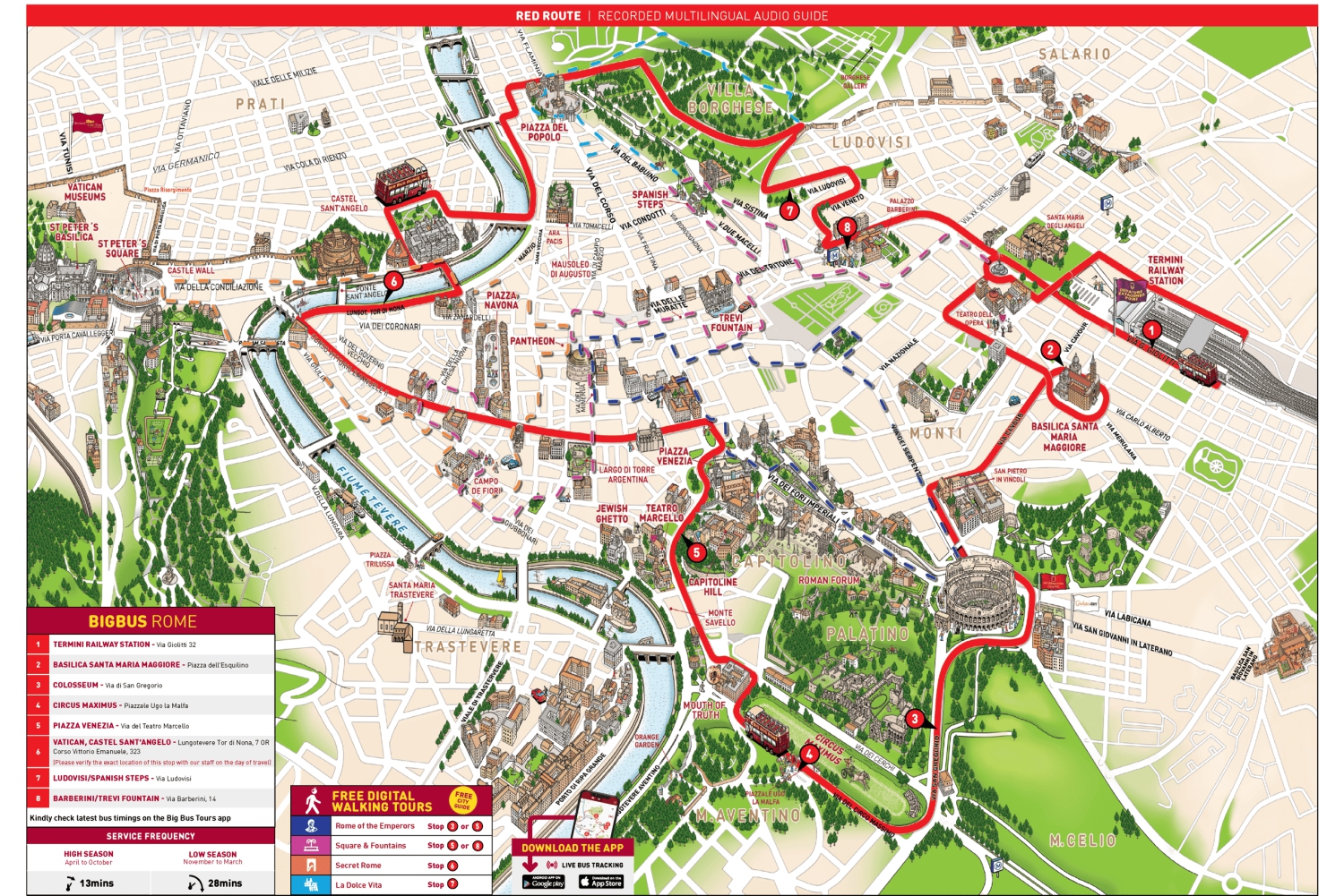 - 乗車前に、どの停留所でもビッグバススタッフにモバイルクーポンまたはQRコードをご提示ください。 推奨アクティベーションポイント:メインターミナル(ストップ1、テルミニ鉄道駅、Via Giovanni Giolitti 32)とビッグバスショップ&インフォメーションセンター(Via delle Terme di Diocleziano 34、ストップ1近く)。 すべてのバスは車椅子対応で、下階にエアコンが完備されています。 72時間チケットには、パノラマナイトツアー(5月から10月のみ)が含まれます。このツアーは乗り降り自由ではありません。ツアーはストップ1から午後8時20分と8時30分に発車し、所要時間は1時間です。ご乗車時間の30分前までにご到着ください。 4歳以下の乳幼児は無料でご乗車いただけます。チケットは不要です。