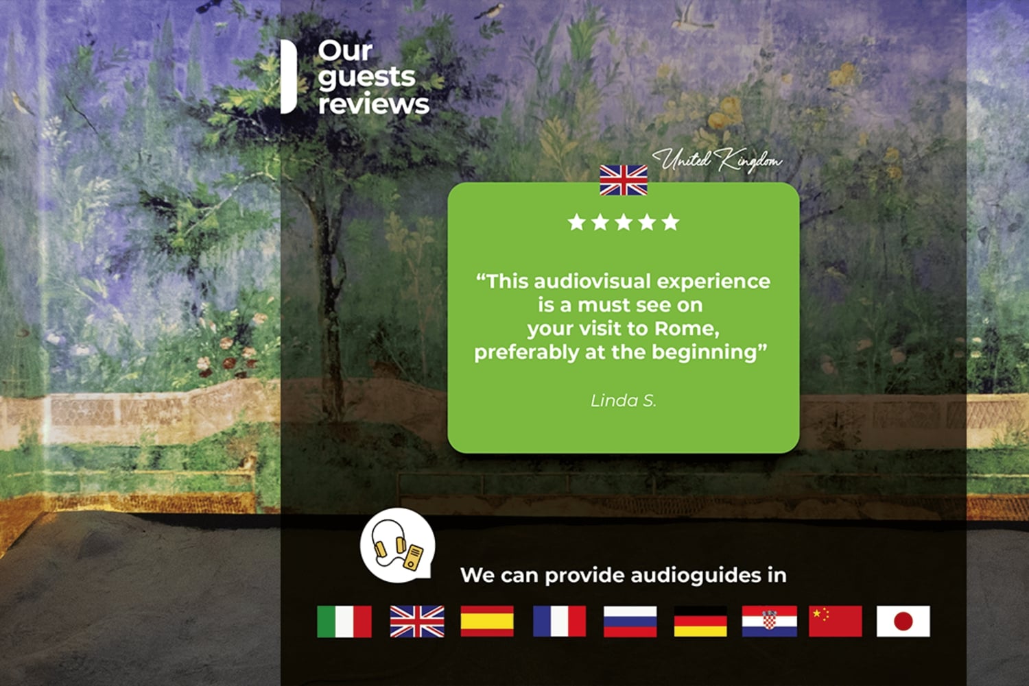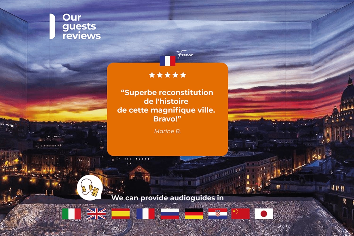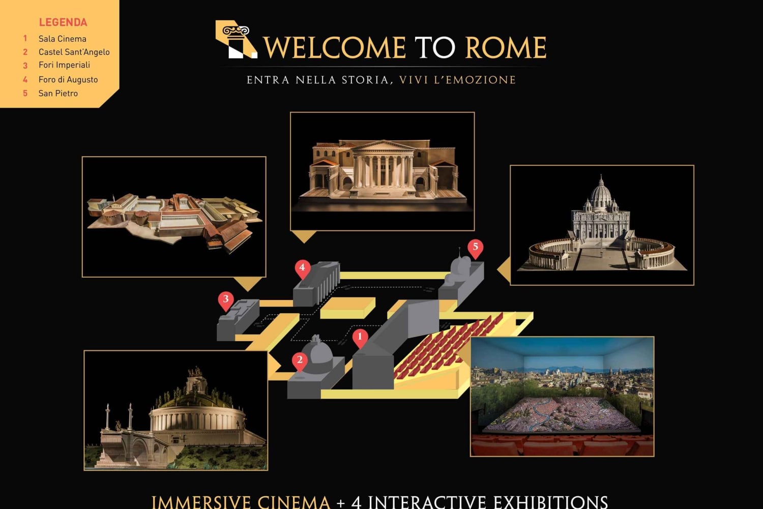 Welcome To Romeでは、この素晴らしい街の歴史に浸り、エキサイティングで魅力的な体験をすることができます。Welcome To Romeを訪れることは、時間と空間を旅することを意味します。 マルチプロジェクションを目の当たりにする体験です。周囲の壁や天井が生き生きと動き出し、地上では街の大きな模型が点灯して、何世紀にもわたるローマの進化を示します。この没入型プロジェクションは、永遠の都のアイデンティティを築いてきた時代を通じて、2700年にわたるローマの歴史を27分間で伝えます。何世紀にもわたって街の上を飛び回り、記念碑、宮殿、教会、広場を移動しているような錯覚に陥るでしょう。 訪問を完了するには、4つの大きなインタラクティブモデルを鑑賞して、いくつかの並外れた傑作の歴史を発見することができます。帝国フォーラム、アウグストゥスフォーラム、ハドリアヌス廟、サンピエトロ大聖堂です。壮大なプロジェクションとインタラクティブなモデルは、ユニークでエキサイティングな体験を提供し、この素晴らしい街の進化を直接体験することができます。 ショーは、Corso Vittorio Emanuele II, 203 にある、元シネマ アウグストゥスで開催されます。プロジェクションとインタラクティブな展示は、障害のある方にもご利用いただけます。ショーは継続的に行われるため、営業時間中はいつでも見学を開始できます。イタリア語、英語、スペイン語、フランス語、ドイツ語、ロシア語、中国語、クロアチア語、日本語の 9 か国語で利用できるオーディオ ガイドが同行します。Includes