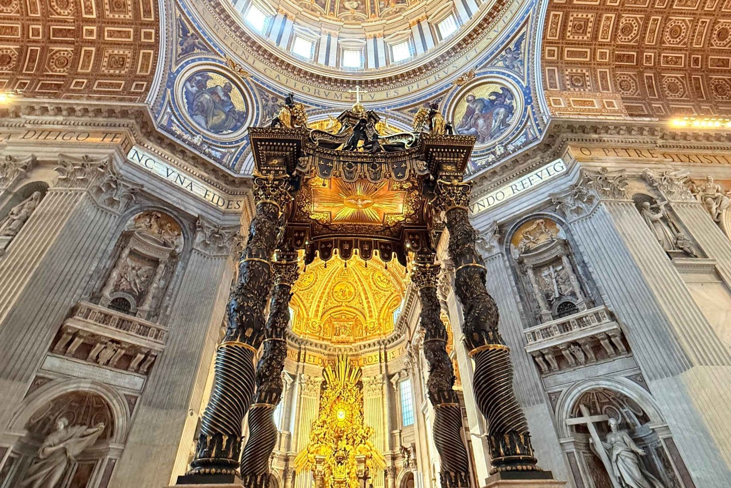 Begin je reis op het Sint-Pietersplein, waar je deskundige gids je kennis laat maken met de rijke geschiedenis van Vaticaanstad en de basiliek. Sla de lange wachtrijen over en betreed de adembenemende Sint-Pietersbasiliek, de grootste kerk ter wereld. Bewonder meesterwerken zoals Michelangelo's Pietà en Bernini's grootse bronzen baldakijn. Daal vervolgens af naar de Vaticaanse Grotten, heilige ondergrondse kamers met de graven van meer dan 90 pausen, waaronder Sint-Pieter zelf. Leer meer over de vroege christelijke kerk, de oorspronkelijke 4e-eeuwse fundamenten van de basiliek en de spirituele betekenis van deze heilige plek. Beklim ten slotte de koepel van Michelangelo. Neem de lift naar het terras en beklim de resterende treden via een smalle wenteltrap. Boven aangekomen word je beloond met een onvergetelijk 360° uitzicht over het Sint-Pietersplein, de Vaticaanse tuinen en heel Rome. Tijdens de rondleiding vertelt je gids fascinerende verhalen over geloof, kunst en geschiedenis, waardoor dit een indrukwekkende ervaring is voor zowel nieuwe bezoekers als terugkerende pelgrims.Includes