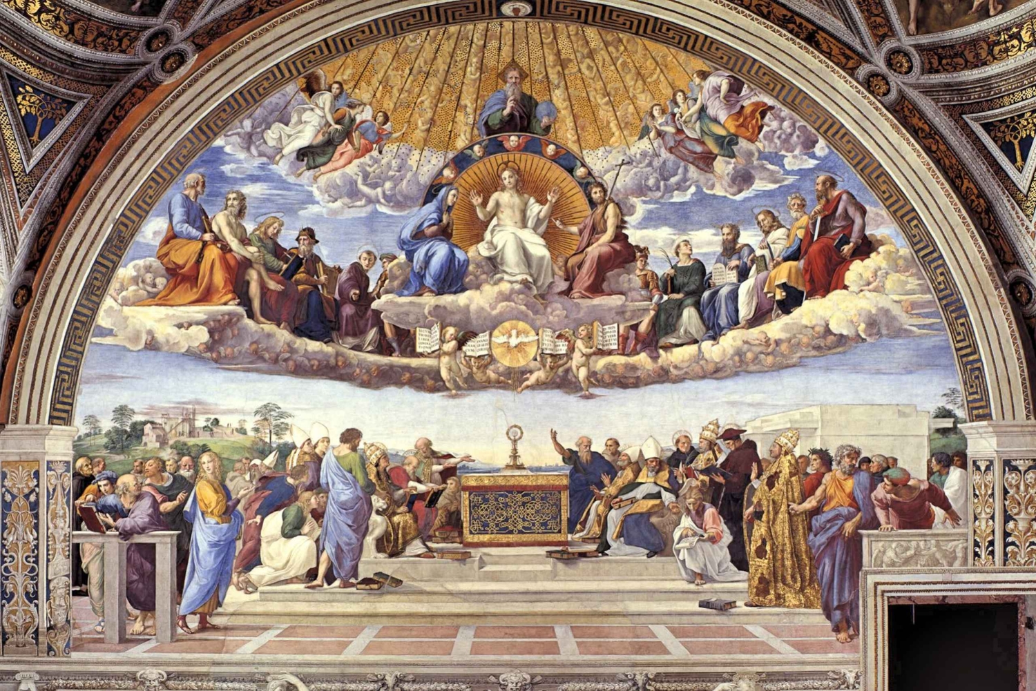 Guidad tur inne i Vatikanen Innergård med kottar Åttkantig innergård Antik Laokoon-staty Antik Apollo-staty Belvedere Torso Raphaels rum Mästerverket 'Skolan i Aten' Galleri med kartor Sixtinska kapellet Michelangelos Sixtinska kapellets tak Berninis brons baldakinImportant Information